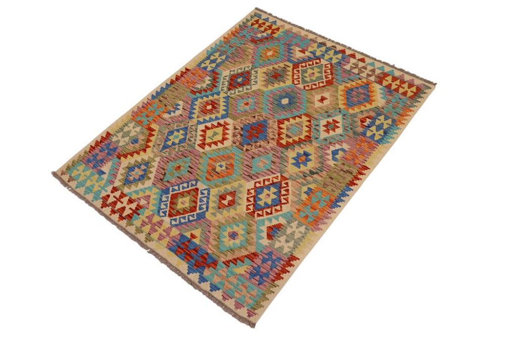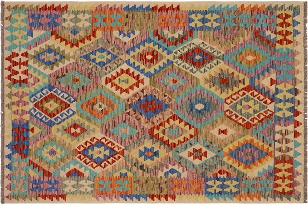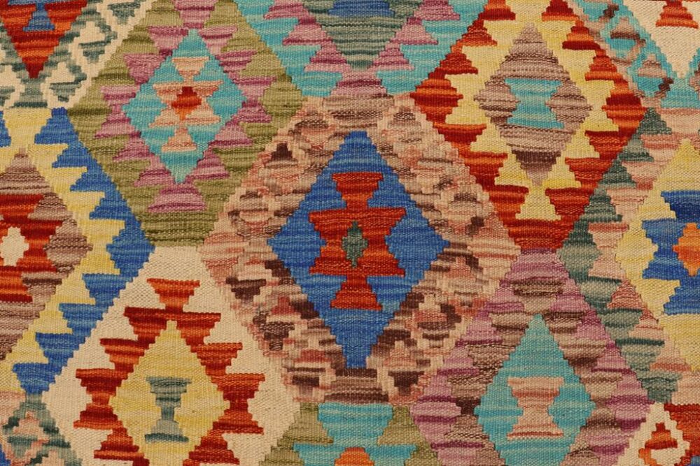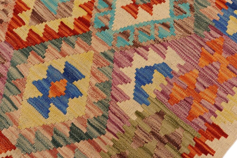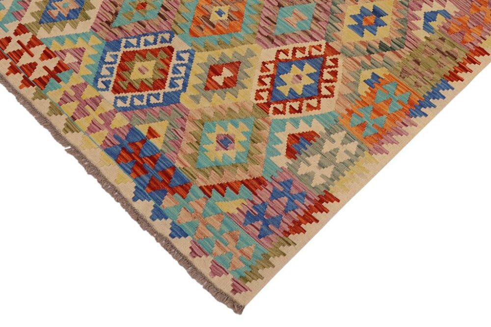 Add a touch of elegance to your home with this tribal Kilim rug. Constructed on a loom by Nomad people with hand spun wool and 100% Natural Vegetable dyes these beautiful rugs are known for their beautiful repetitive geometric pattern with naturalistic traditional and modern patterns. The contemporary fashion palette produces bold, sharp patterns that are ingeniously versatile as the pattern is same in the front and back.