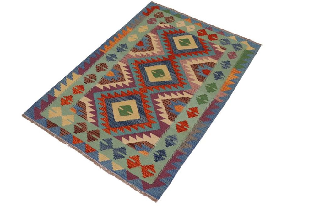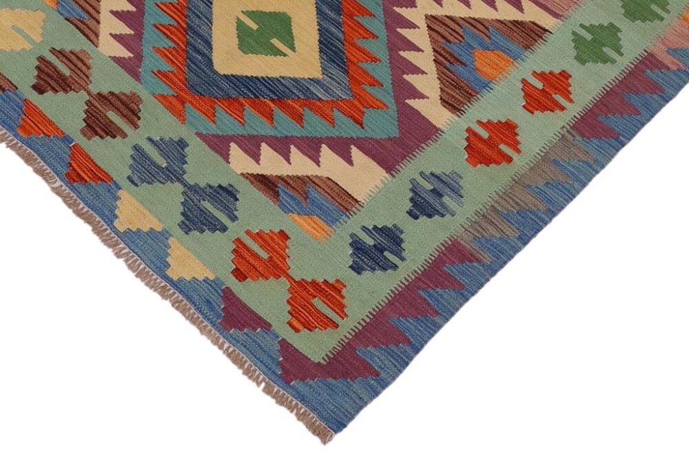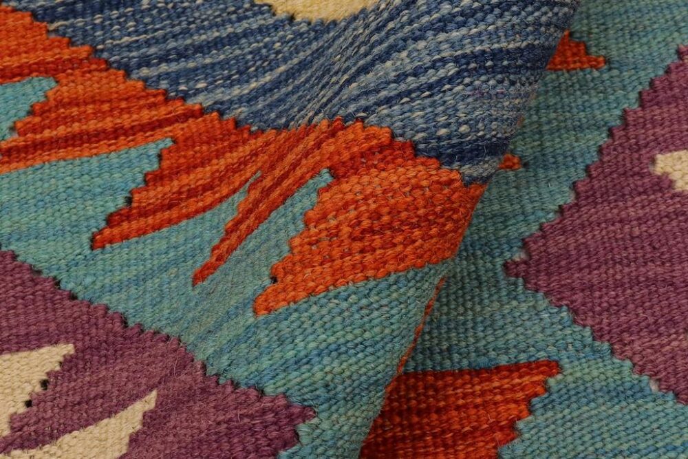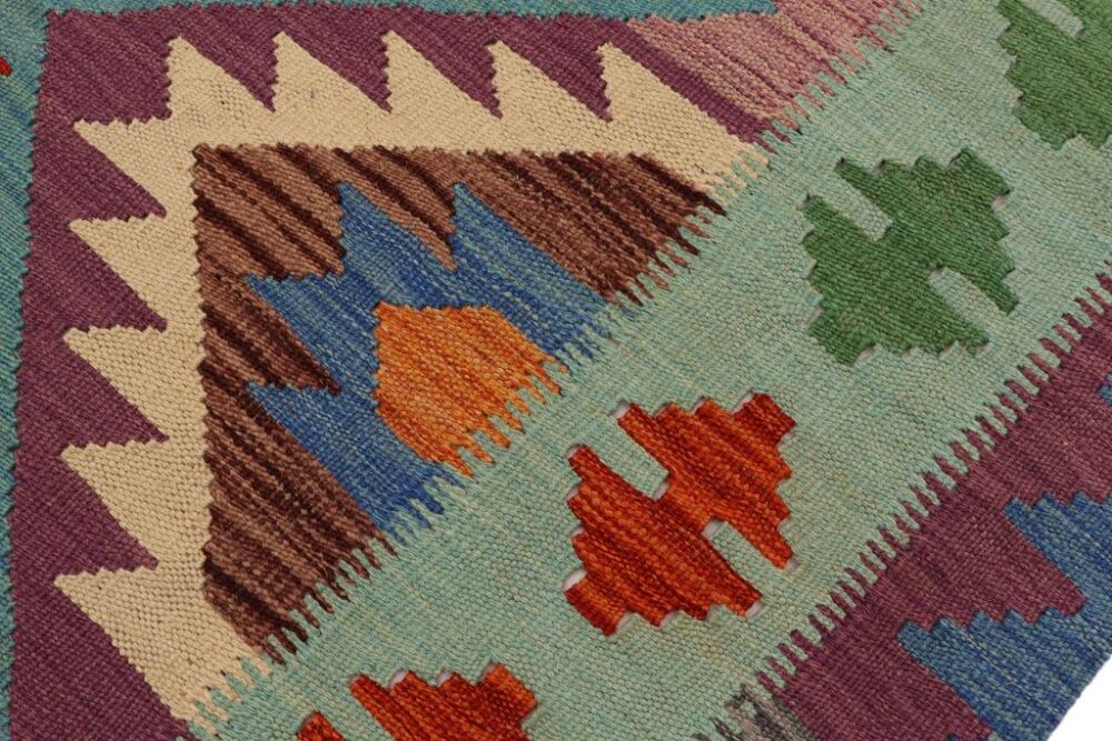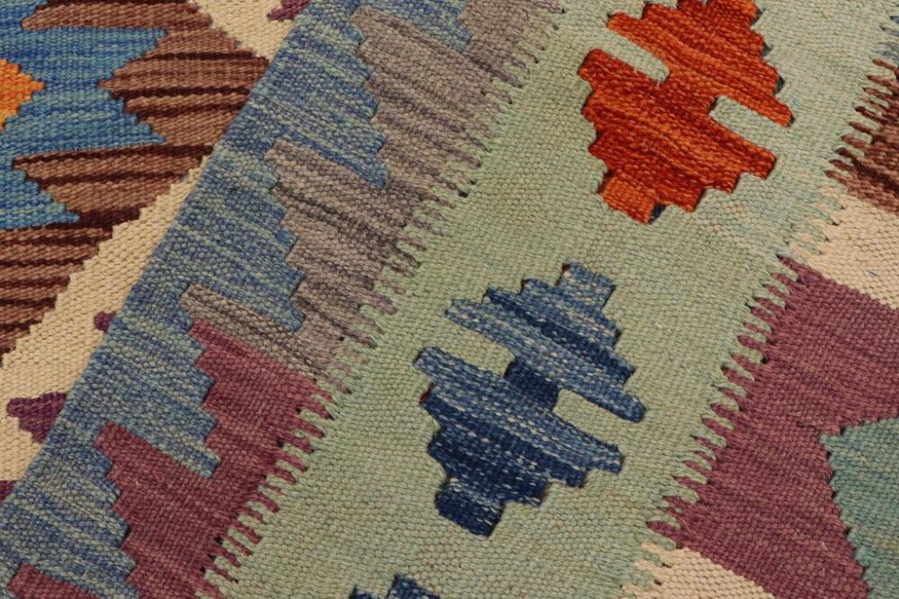 Add a touch of elegance to your home with this tribal Kilim rug. Constructed on a loom by Nomad people with hand spun wool and 100% Natural Vegetable dyes these beautiful rugs are known for their beautiful repetitive geometric pattern with naturalistic traditional and modern patterns. The contemporary fashion palette produces bold, sharp patterns that are ingeniously versatile as the pattern is same in the front and back.