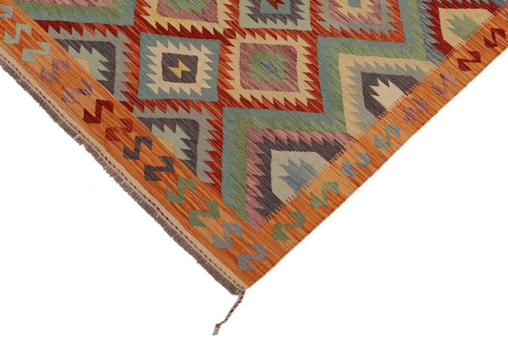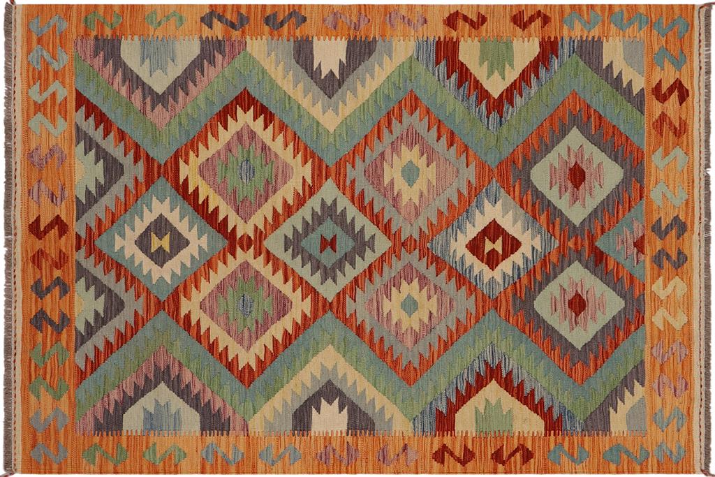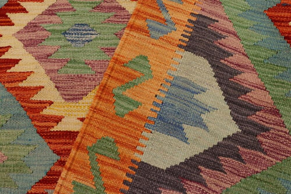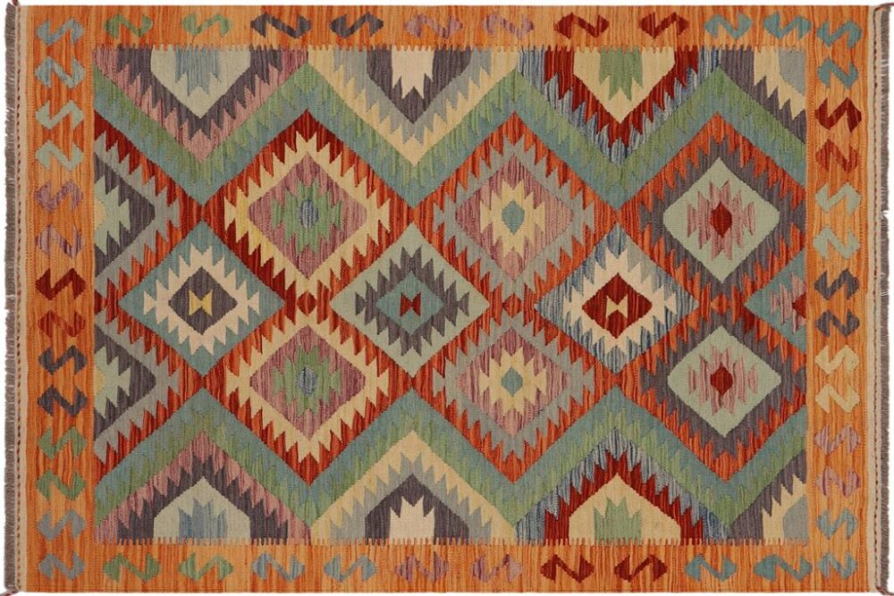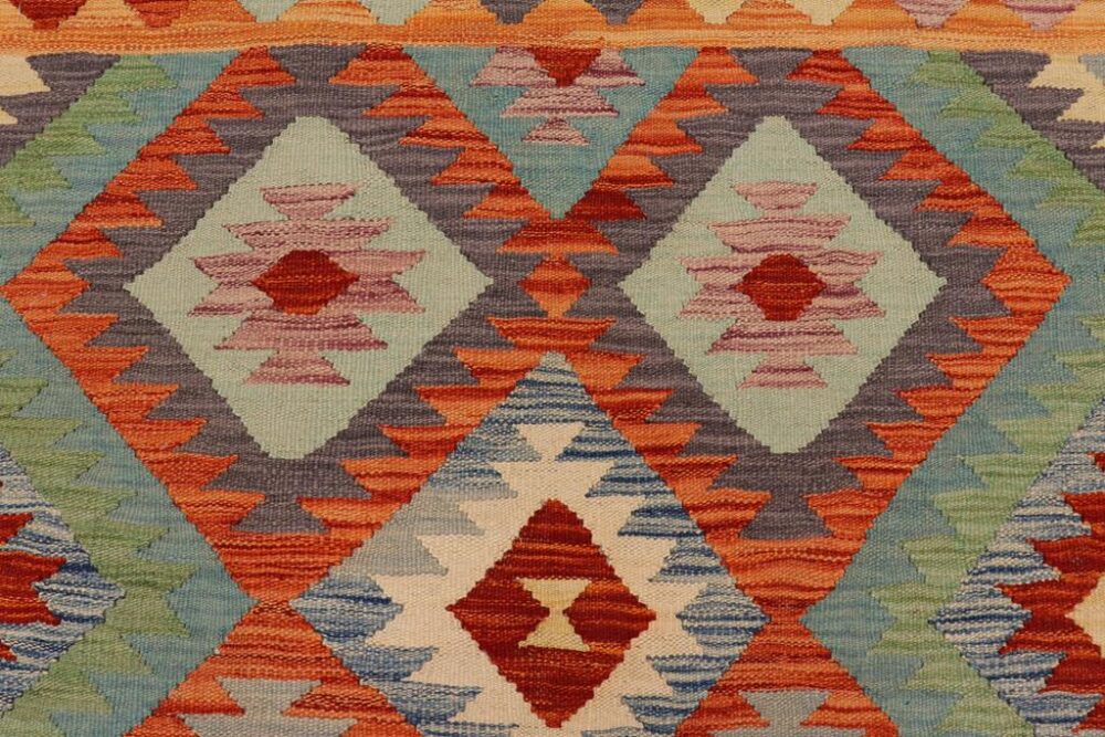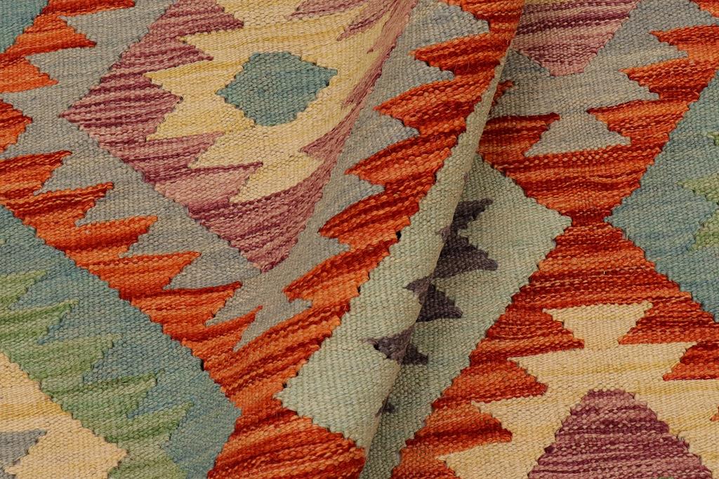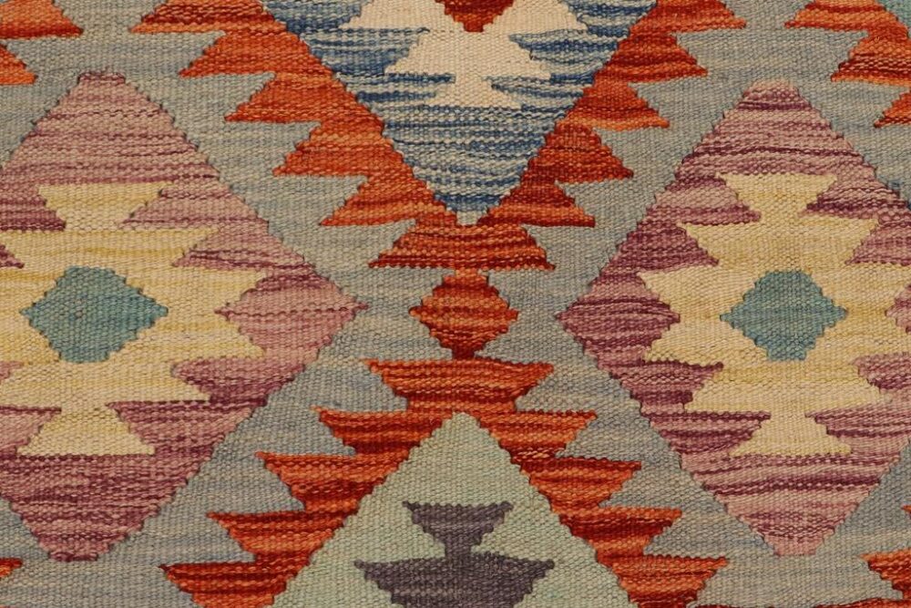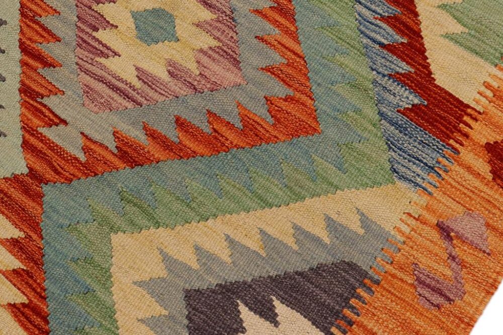 Add a touch of elegance to your home with this tribal Kilim rug. Constructed on a loom by Nomad people with hand spun wool and 100% Natural Vegetable dyes these beautiful rugs are known for their beautiful repetitive geometric pattern with naturalistic traditional and modern patterns. The contemporary fashion palette produces bold, sharp patterns that are ingeniously versatile as the pattern is same in the front and back.
