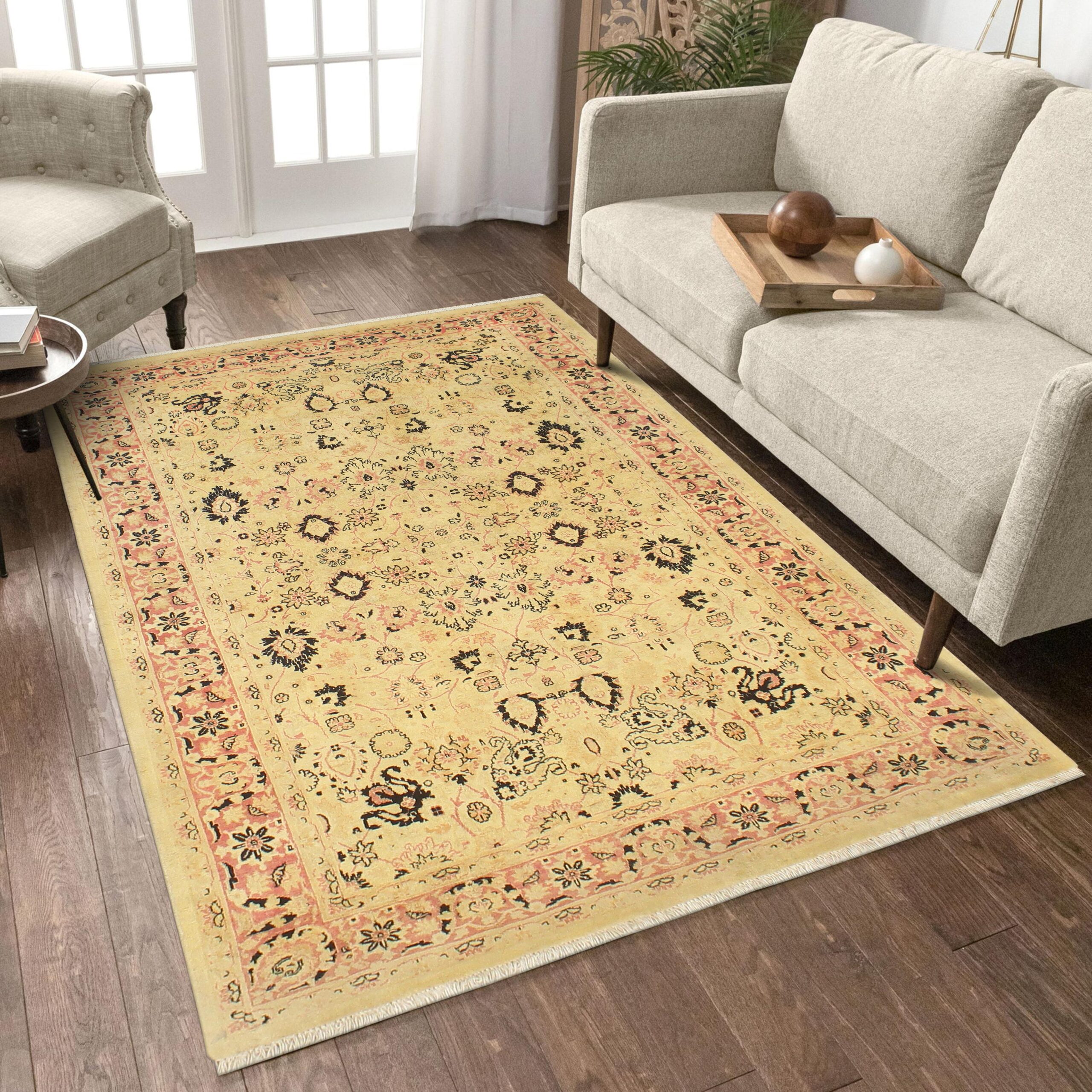 Designed with mesmerizing intricacy and gorgeous color palette, this hand-knotted masterpiece demonstrates the beauty and electrifying thrill of Pak Persian art. Made with all handspun wool and vegetable dyes with KPSI of 250-300, this meticulously handcrafted Pak-Persian rug is made with pure wool and features breathtaking traditional and transitional designs in the beautiful lush color pallet. Known for their intricate designs these rugs are a reproduction of Persian rugs, made in Pakistan with unique Mughal designs. Made by master weavers using the same Persian texture, design, and vegetable dying technique, we wanted to create the most significant manifestation of Persian art, life, and culture. This rug is most famous for its exceptional quality, incredible designs, patterns, and vibrant rich color. Pak-Persian rugs made with Persian weave with high knot counts, which enables the high intricacy and detail found in the patterns are also referred to as State of art, each color adds a rich beautiful detail in the artwork of this rug. The design, color and beautiful chromatic composition with a vibrant sheen with traditional and transitional designs exude beauty, elegance, and quality make this rug a masterpiece of its own.