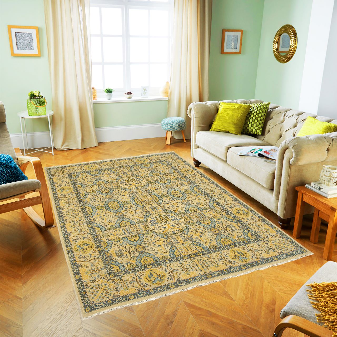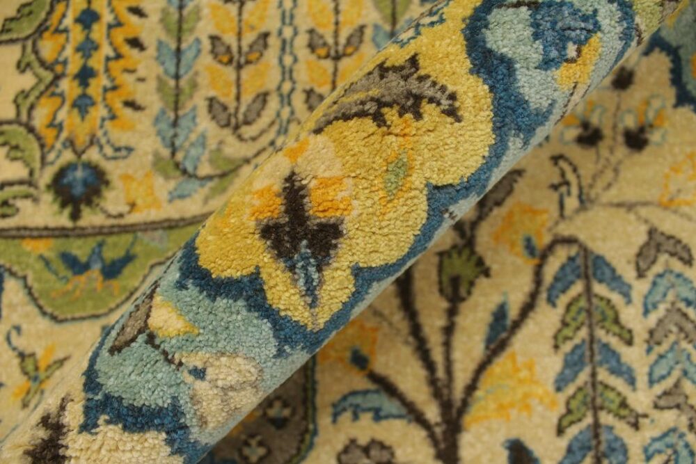Designed with a mesmerizing intricate traditional motif this glorious hand knotted rug is a masterpiece that will fill any space with sophistication and grace. An exhilarating color pallet with an elaborate design, this masterpiece features luxurious hand spun wool with all vegetable dyes to add comfort and style to your décor. The design, color and beautiful chromatic composition with a sheen in traditional and transitional designs, exude beauty, elegance and quality make this rug a masterpiece of its own