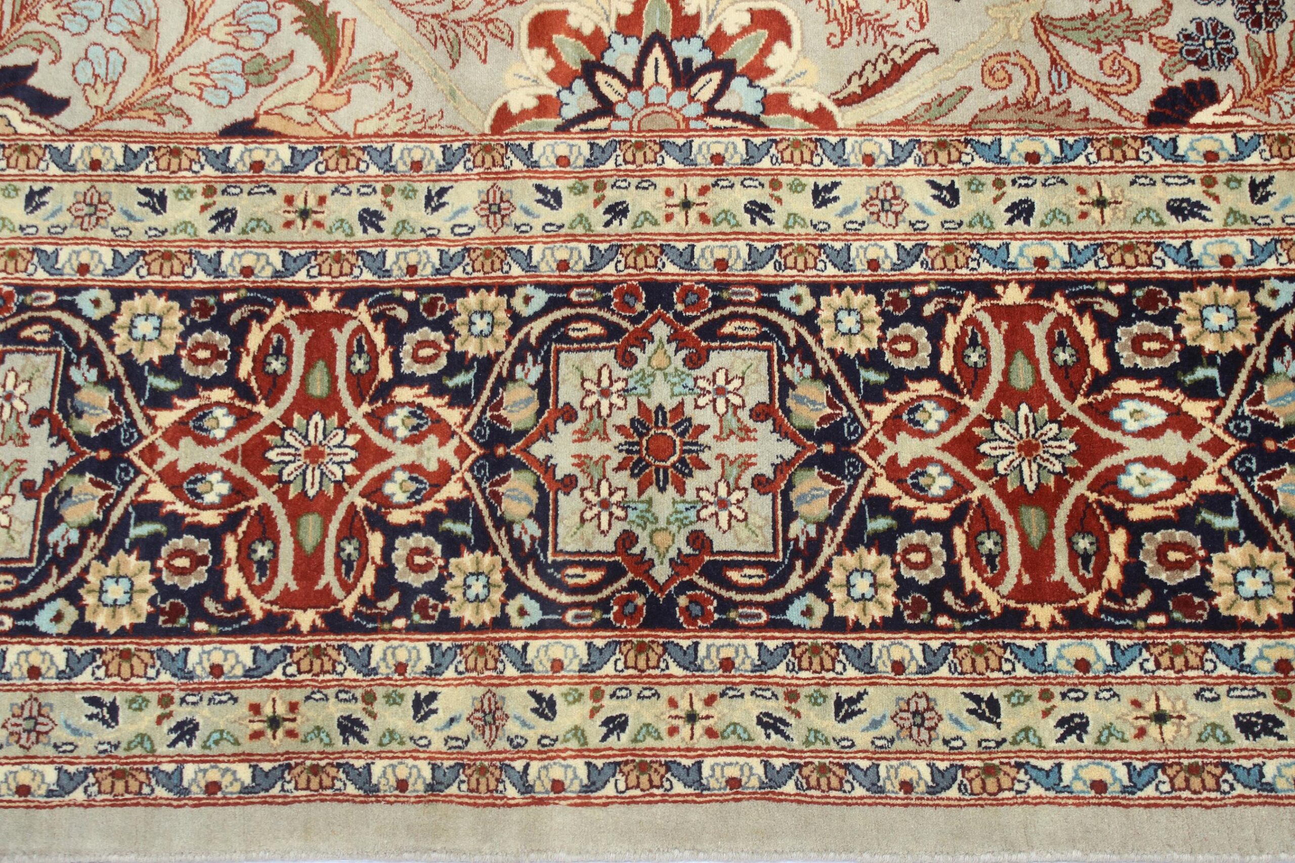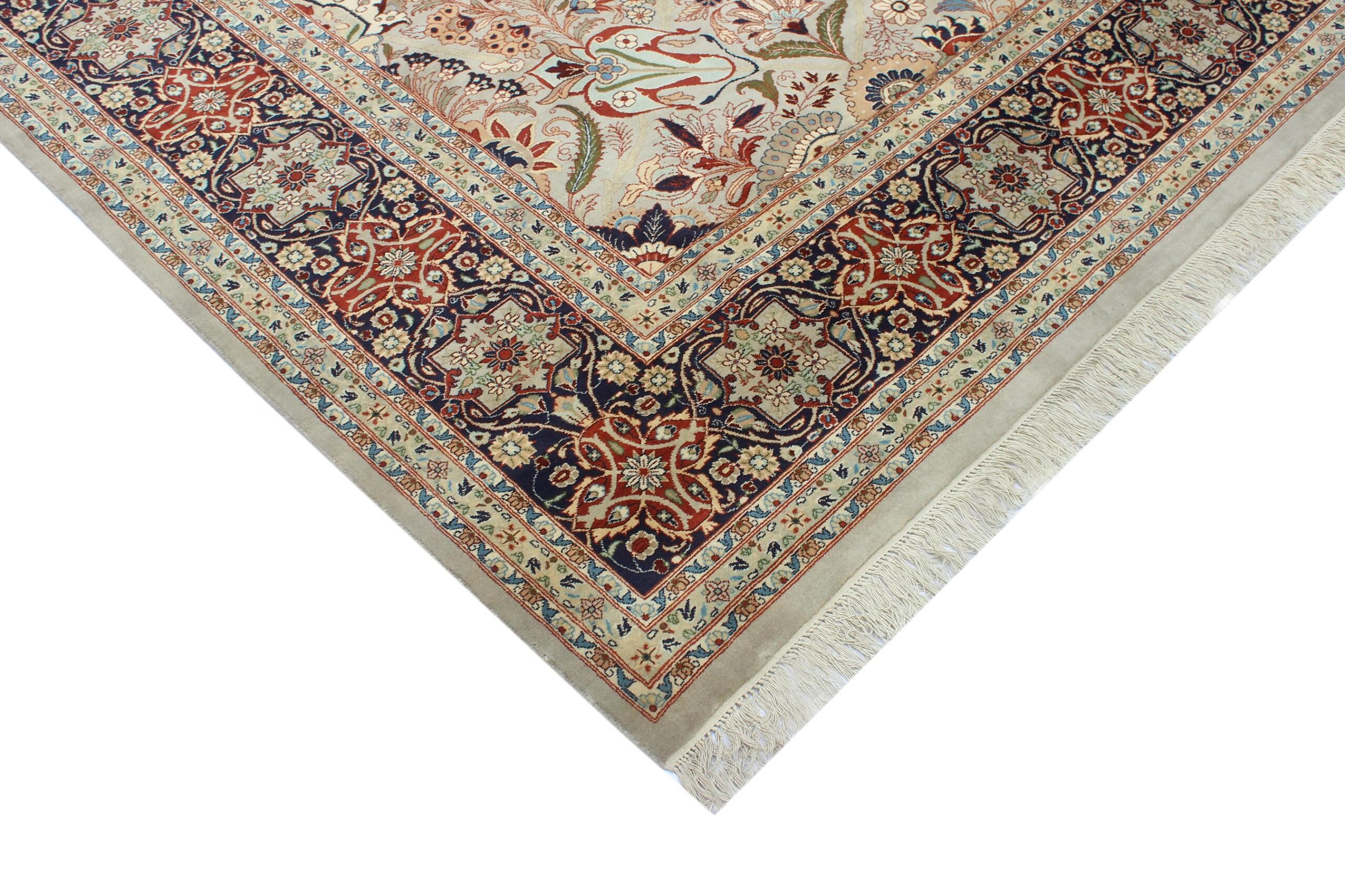 Designed with mesmerizing intricacy and gorgeous color palette, this hand-knotted masterpiece demonstrates the beauty and electrifying thrill of Pak Persian art. These meticulously handcrafted Pak-Persian rug is made with pure wool and features breathtaking traditional and transitional designs in bold lush color pallet. Known for their intricate designs these rugs are a reproduction of Persian rugs, made in Pakistan with unique Mughal designs. Made by master weavers using the same Persian texture, design and dying technique, we wanted to produce the most significant manifestation of the Persian art, life and culture. This rug is most famous for its exceptional quality, incredible designs, patterns and vibrant rich color. Pak-Persian rugs made with Persian weave with high knot counts, which enables the high intricacy and detail found in the patterns are also referred to as “State of art”, each color adds a rich beautiful detail in the artwork of this rug. The design, color and beautiful chromatic composition with a vibrant sheen with traditional and transitional designs, exude beauty, elegance and quality make this rug a masterpiece of its own.