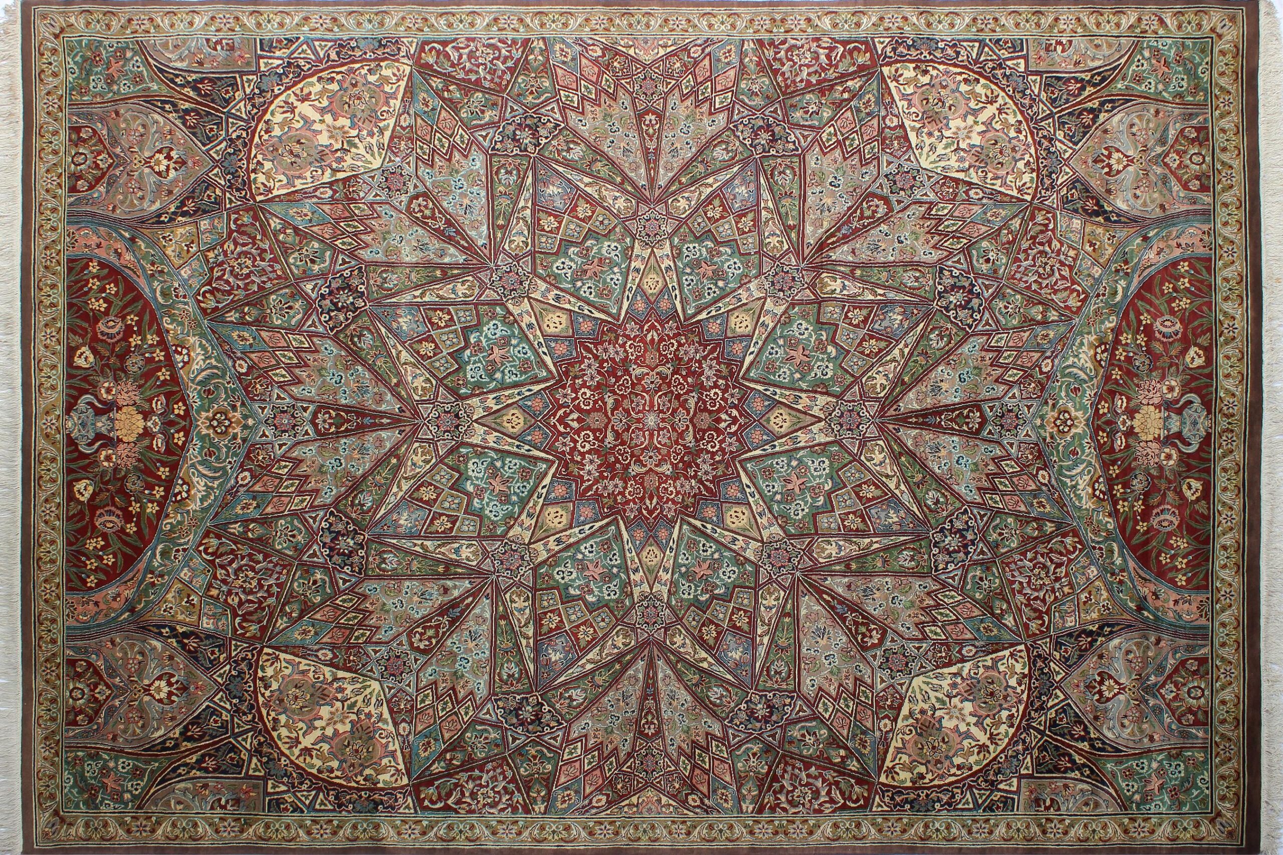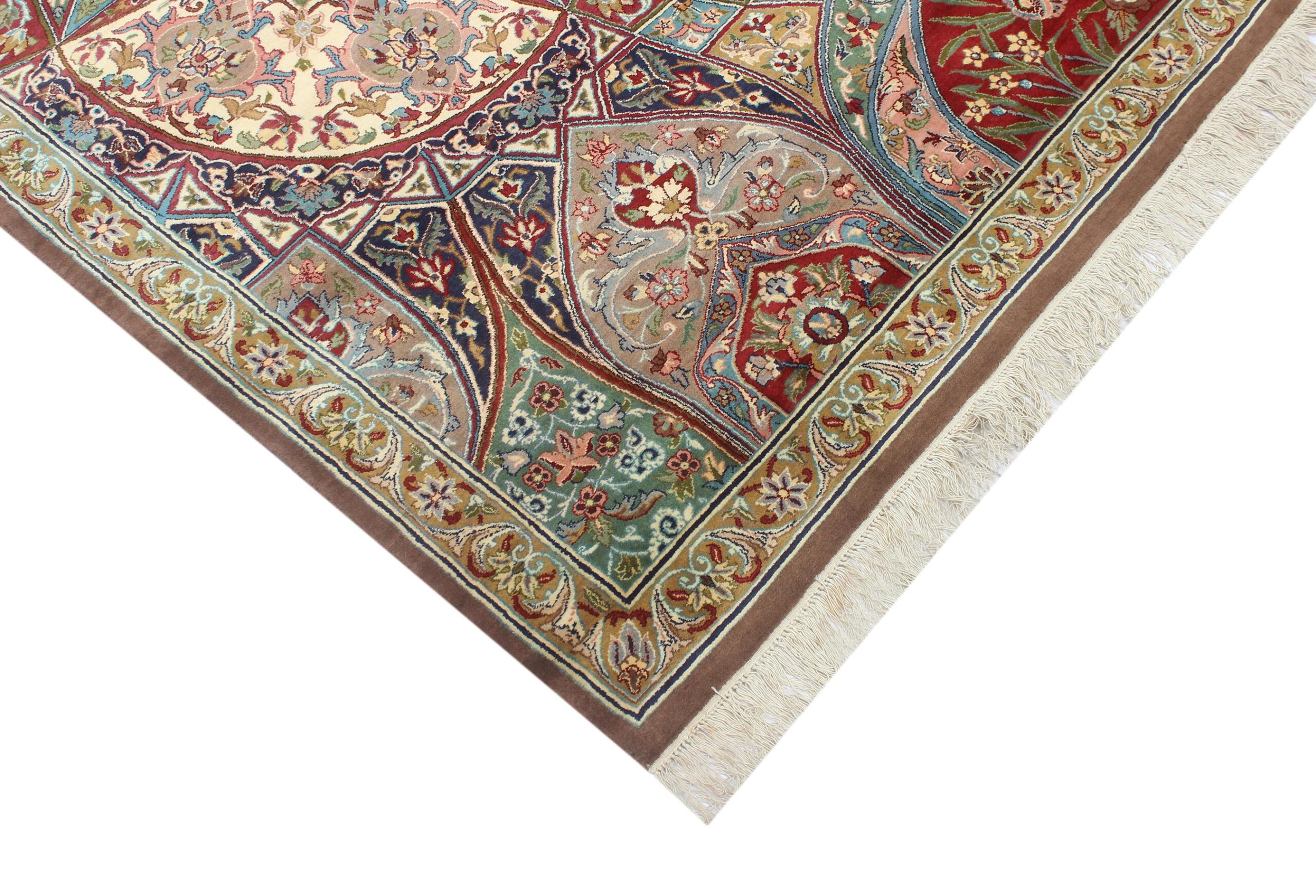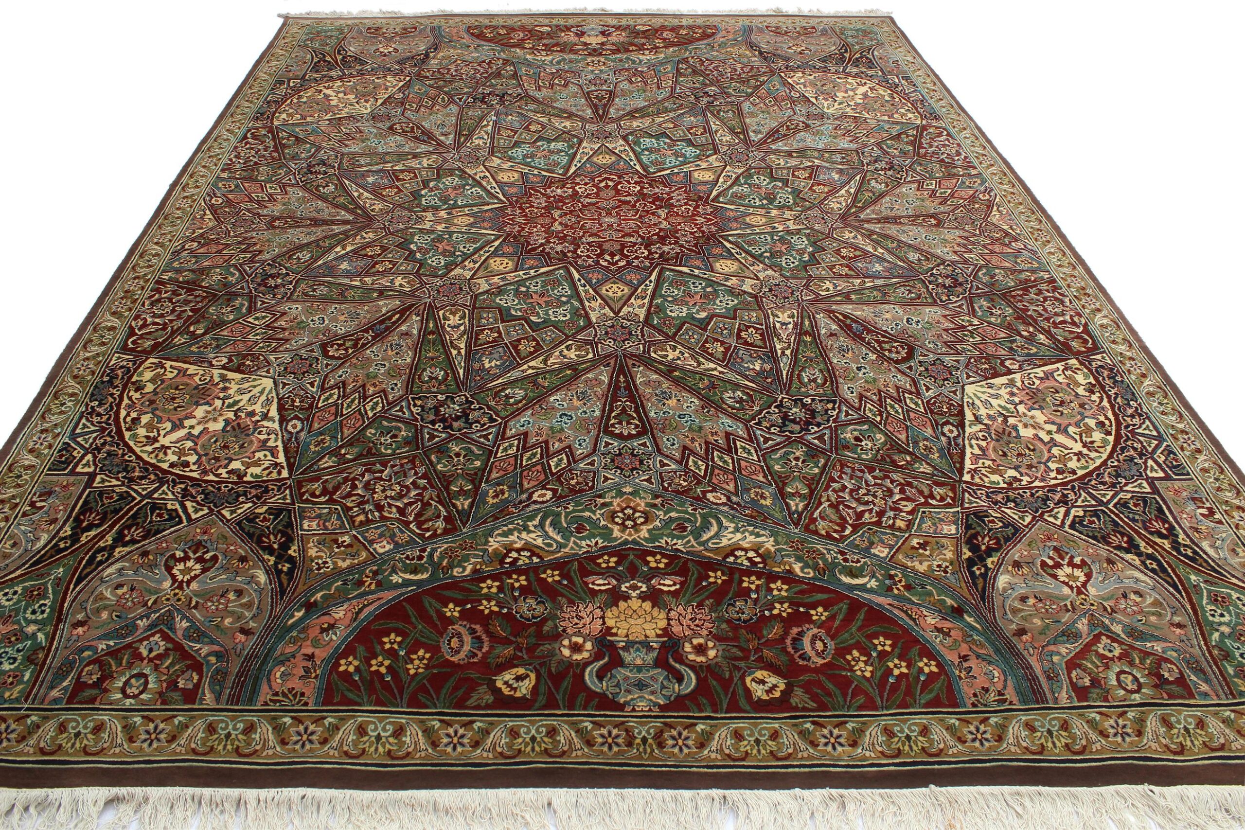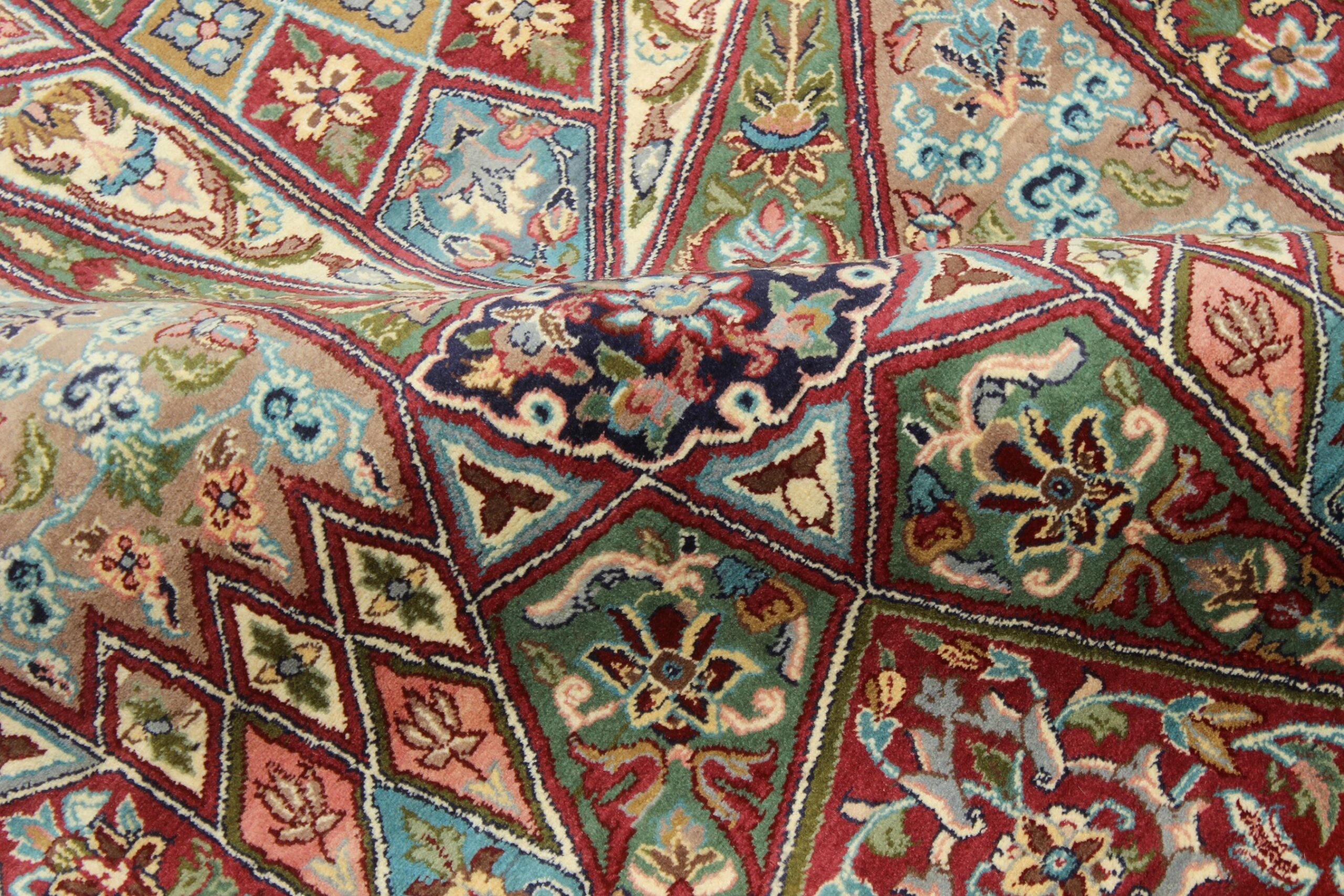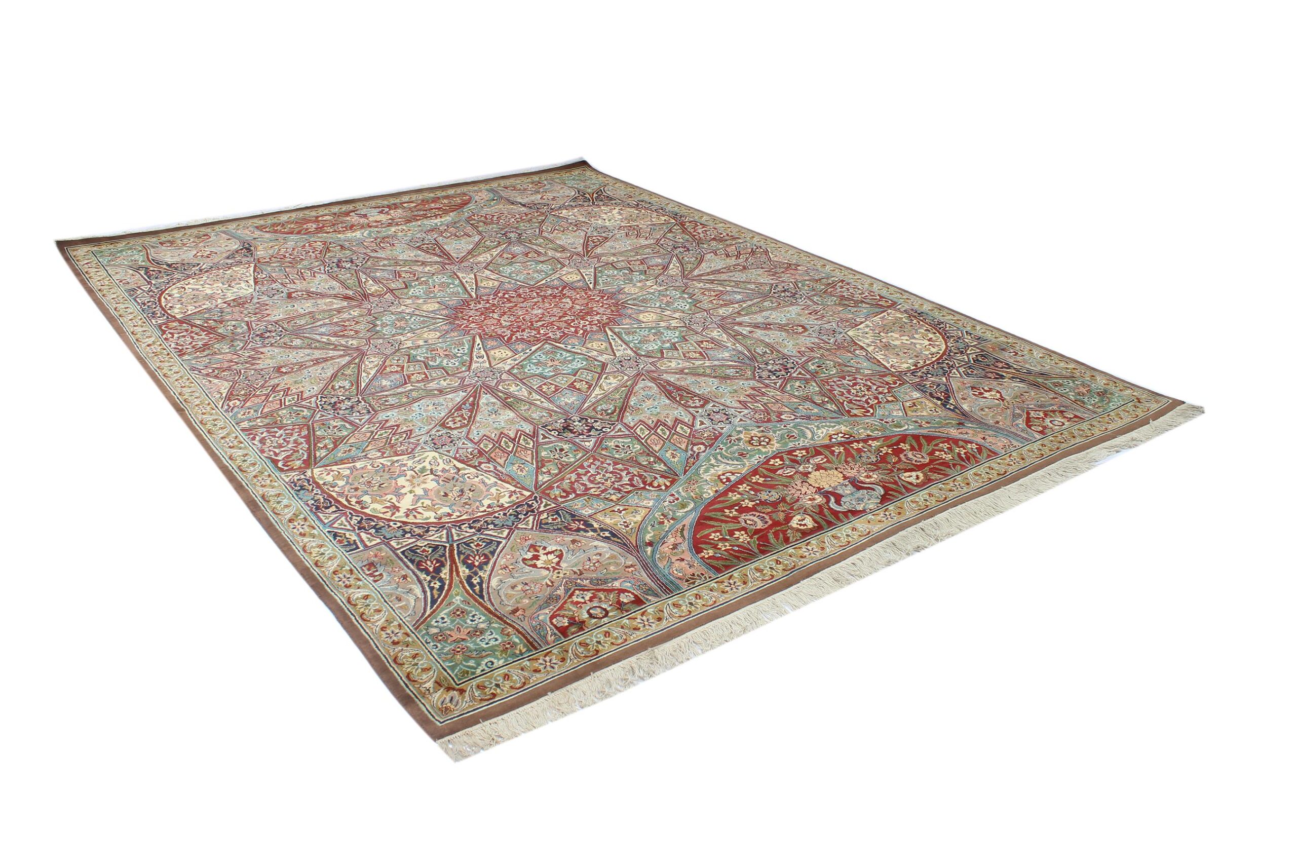 Designed with mesmerizing intricacy and gorgeous color palette, this hand-knotted masterpiece demonstrates the beauty and electrifying thrill of Pak Persian art. These meticulously handcrafted Pak-Persian rug is made with pure wool and features breathtaking traditional and transitional designs in bold lush color pallet. Known for their intricate designs these rugs are a reproduction of Persian rugs, made in Pakistan with unique Mughal designs. Made by master weavers using the same Persian texture, design and dying technique, we wanted to produce the most significant manifestation of the Persian art, life and culture. This rug is most famous for its exceptional quality, incredible designs, patterns and vibrant rich color. Pak-Persian rugs made with Persian weave with high knot counts, which enables the high intricacy and detail found in the patterns are also referred to as “State of art”, each color adds a rich beautiful detail in the artwork of this rug. The design, color and beautiful chromatic composition with a vibrant sheen with traditional and transitional designs, exude beauty, elegance and quality make this rug a masterpiece of its own.