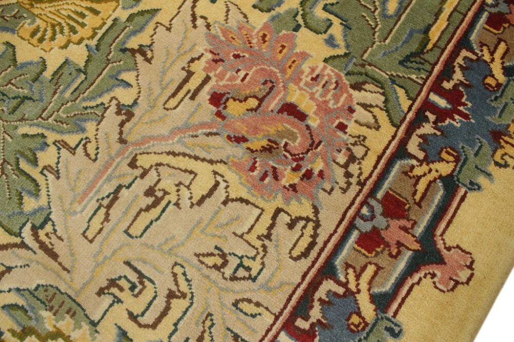 Designed with mesmerizing intricacy and gorgeous color palette, this hand-knotted masterpiece demonstrates the beauty and electrifying thrill of Pak Persian art. These meticulously handcrafted Pak-Persian rug is made with pure wool and features breathtaking traditional and transitional designs in bold lush color pallet. Known for their intricate designs these rugs are a reproduction of Persian rugs, made in Pakistan with unique Mughal designs. Made by master weavers using the same Persian texture, design and dying technique, we wanted to produce the most significant manifestation of the Persian art, life and culture. This rug is most famous for its exceptional quality, incredible designs, patterns and vibrant rich color. Pak-Persian rugs made with Persian weave with high knot counts, which enables the high intricacy and detail found in the patterns are also referred to as “State of art”, each color adds a rich beautiful detail in the artwork of this rug. The design, color and beautiful chromatic composition with a vibrant sheen with traditional and transitional designs, exude beauty, elegance and quality make this rug a masterpiece of its own.